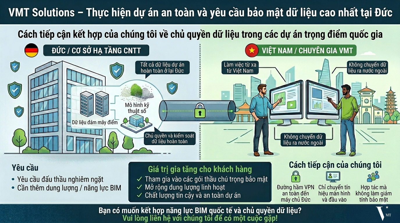 Trong nhiều dự án trọng điểm cấp quốc gia tại Đức, các yêu cầu nghiêm ngặt được áp dụng: dữ liệu dự án và dữ liệu hiện trạng không được phép rời khỏi lãnh thổ trong suốt quá trình xử lý.